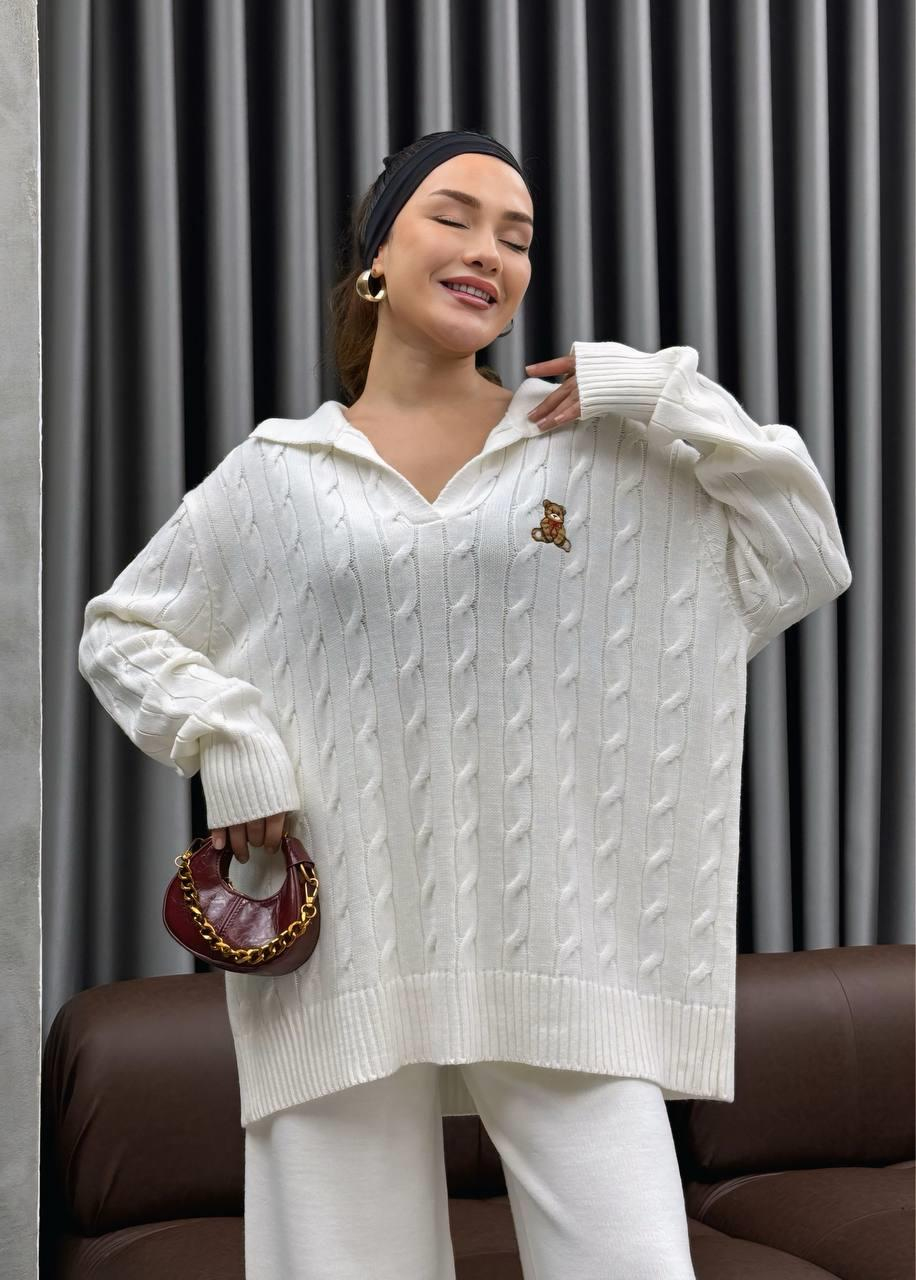 Sezonun en sevilen detaylarından biriyle tasarlanan Polo Yaka Ayıcık Nakışlı Triko İkili Takım, yumuşacık dokusu ve rahat kalıbıyla günlük şıklığın vazgeçilmezi olacak.